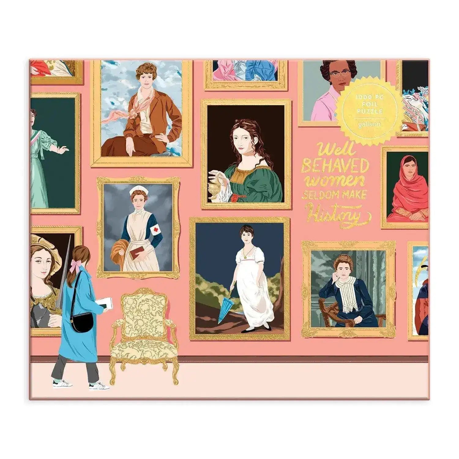 The Herstory Museum 1000 Piece Foil Puzzle features the beautifully detailed art of Ana San Jose. The image on this puzzle reveals a gallery wall with gold foil embellished gilded ramed paintings of famous women in herstory. 'Well Behaved Women Seldom Make History' is inscribed on the gallery wall. Can you guess who they all are? These puzzles are packaged in matte-finish sturdy boxes, perfect for gifting, reuse, and storage.