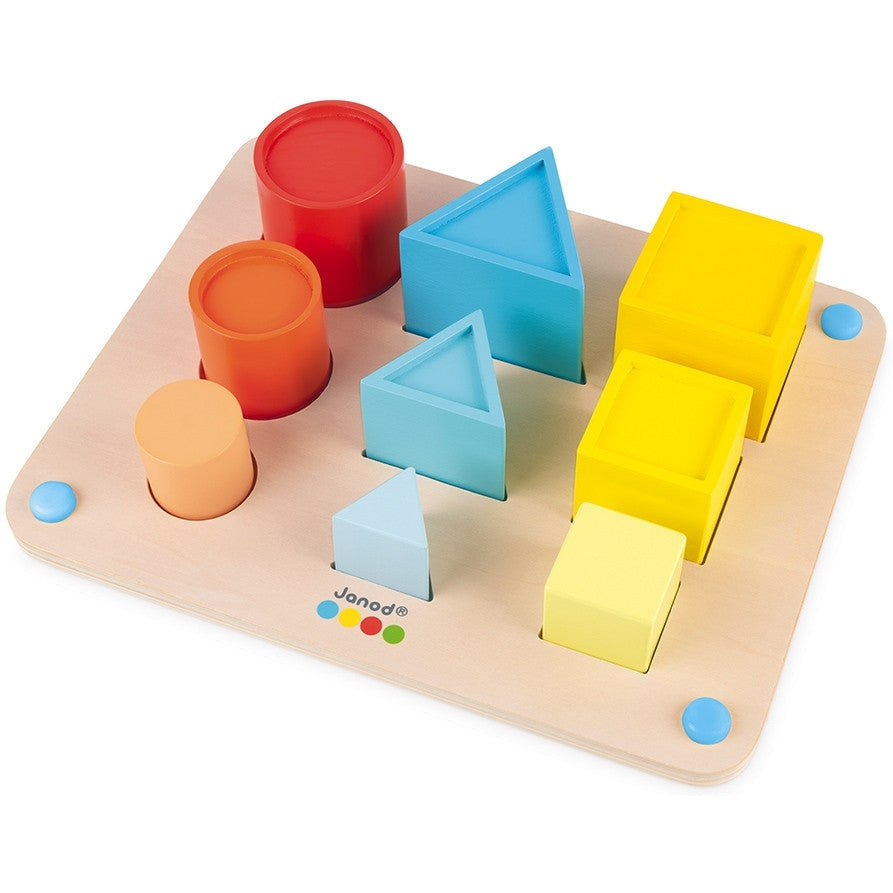 This wooden awakening toy is ideal for learning volumes while having fun. 3 ways to play: embed, stack or interlock! A built-in puzzle to develop the recognition of shapes and colors, a pyramid function when stacking of cubes and learning sizes when the pieces are interlocked. The tray is equipped with non-slip silicone feet for more stability. This awakening toy will help develop fine motor skills, the discovery of shapes and colors and visual-spatial construction. The pieces are water-painted.