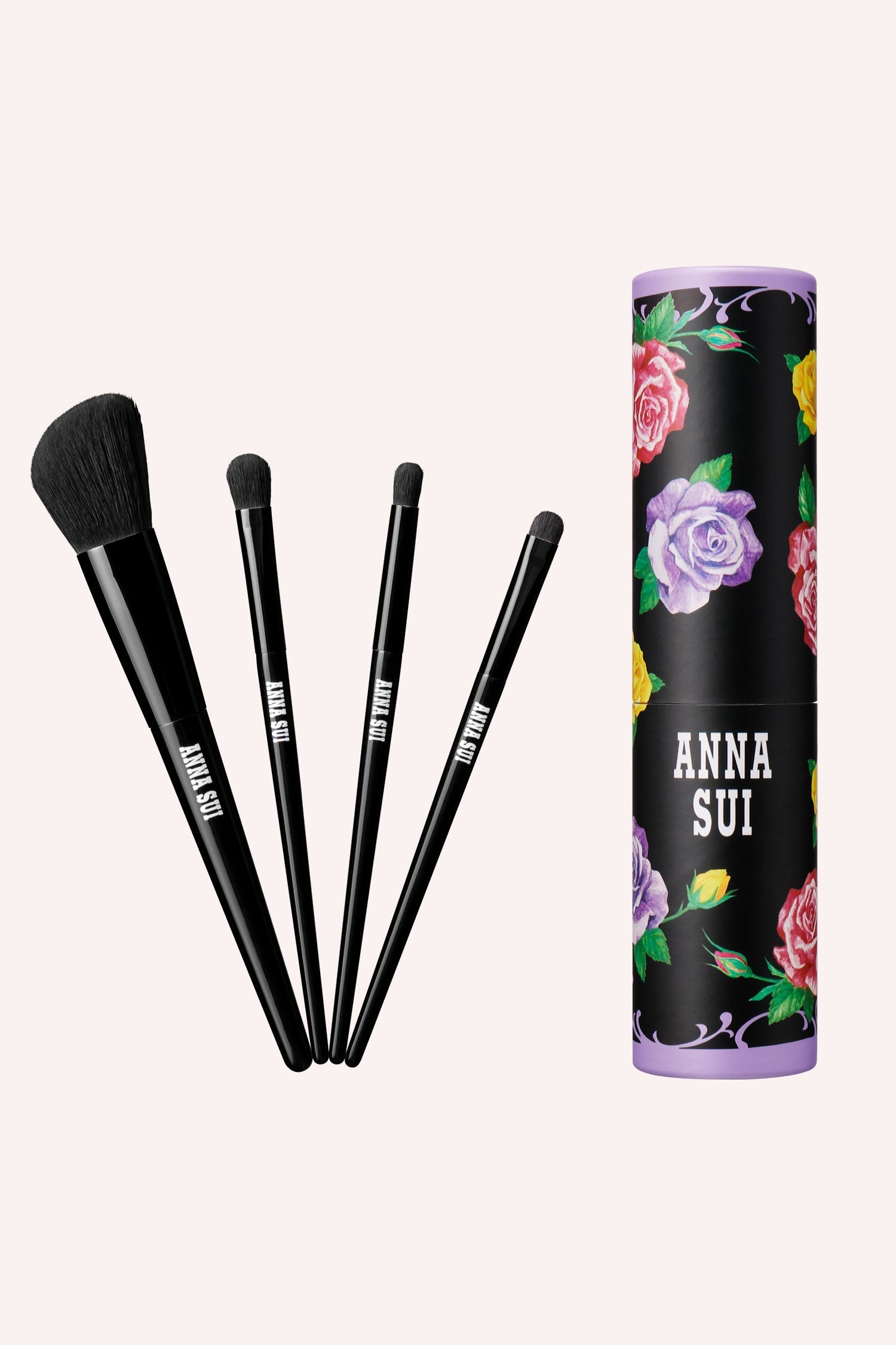 - The brush set features 4 different brushes inside a floral paper tube. Cheek/Highlighter Brush. Flat brush, round brush, and point brush for eyeshadow.