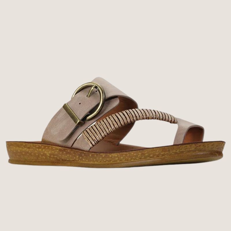 Los Cabos captures the spirit of fun in the sun with their Bria sandal. The ease of a slip-on is given a touch of natural beauty with our woven bamboo wrap gracing the toe strap, whilst the antique round buckle on the back strap adds a treasure box accent. To top off the ensemble the upper is given a special graffiato detailing to add an authentic surface relief.