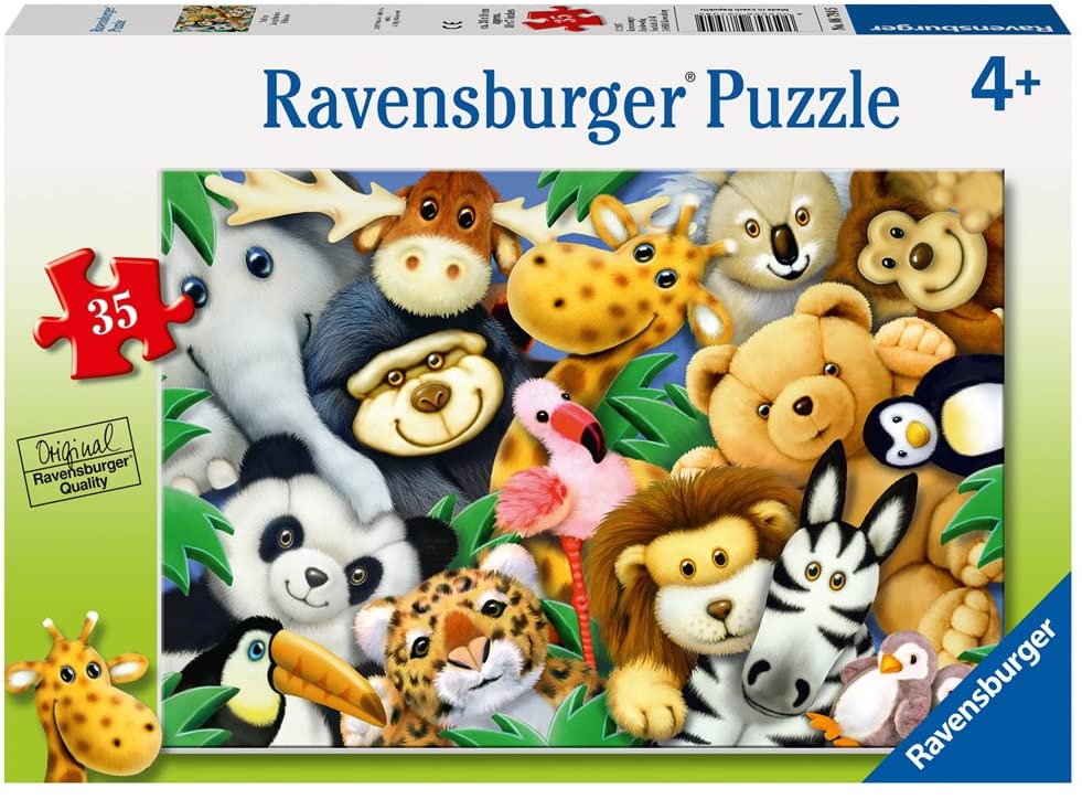 Introducing Softies by Ravensburger, a delightful 35-piece jigsaw puzzle featuring a charming assortment of animals like giraffes, monkeys, bears, and lions happily posing together. This engaging puzzle is perfect for young children, offering a fun and educational experience as they piece together each unique piece. With its vibrant and detailed design, Softies will captivate children's imaginations and provide hours of entertainment. Let your little ones embark on a puzzle adventure with Softies, a must-have addition to any toy collection.