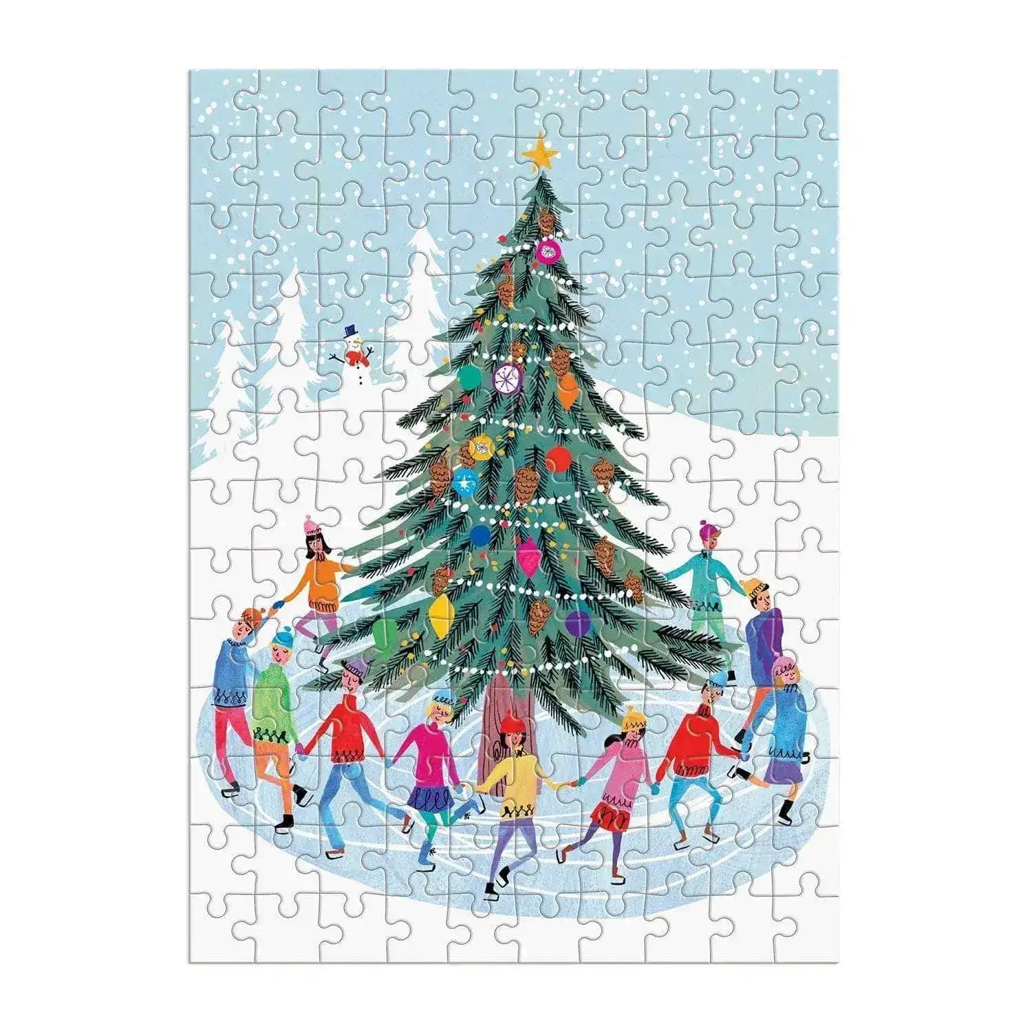 The Tree Skaters 130 Piece Puzzle Ornament is both an ornament to hang on the tree and a mini puzzle. The puzzle features a colorful illustration of ice skaters circling a brightly decorated tree. The puzzle pieces are boxed in a charming little house ornament decorated for the holiday. Ornament includes red string for hanging. Makes a perfect gift!
